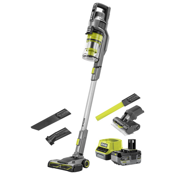 Using the included 4Ah battery , the Ryobi RSVS18 can vacuum for up to 40 minutes on a single charge. This kit includes a RSVS18 ONE+ Cordless Stick Vac, Vacuum Accessories , a 4.0Ah battery and a compact charger.