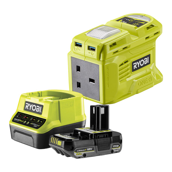 This kit contains the RY18BI150B ONE+ Battery Inverter, a 2.0Ah battery and a charger. Features: