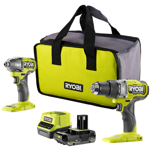 This kit contains the RPD18BL2 ONE+ Brushless Combi Drill, the RID18BL ONE+ Brushless Impact Driver, a 2.5Ah battery, a charger and a tool bag.