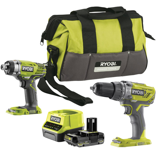 This kit contains the R18PD3 ONE+ Combi Drill, the R18ID3 ONE+ Impact Driver, a 2.0Ah battery, a charger and a tool bag.