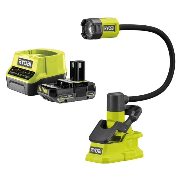 As part of the Ryobi 18V ONE+™ system of over 200 cordless tools for the home, garden, automotive, crafting and much more, the Ryobi 18V ONE+™ RLCF18-120GL Cordless LED Clamp Spotlight Light Starter Kit is ideal for hobbyists and DIYers alike when working on small items close up and where short distance lighting is vital.