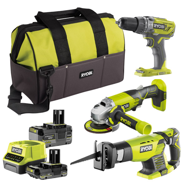 Our Ryobi cordless triple pack includes a cordless angle grinder, cordless reciprocating saw and a cordless combi drill. These tools are accompanied by a 2.0Ah battery, a 4.0Ah battery, a charger and a tool bag.