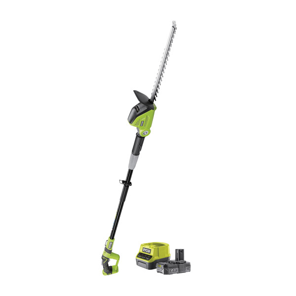 This kit includes a cordless hedge trimmer, one 2.0Ah battery and a 2.0A charger. The OPT1845 features a powerful 18V motor easily cuts through hedges and branches. The Ryobi Extra Long Reach Hedge Trimmer is the ideal tool for reaching for tall and hard-to-reach hedges. This machine extends to 2.9m to reach the highest areas of your garden. Featuring a 115° four-position articulating head with 45cm diamond ground blade. Supplied with a Ryobi shoulder strap and weighing only 4.2kg it is easily handled despite the long reach of the machine.